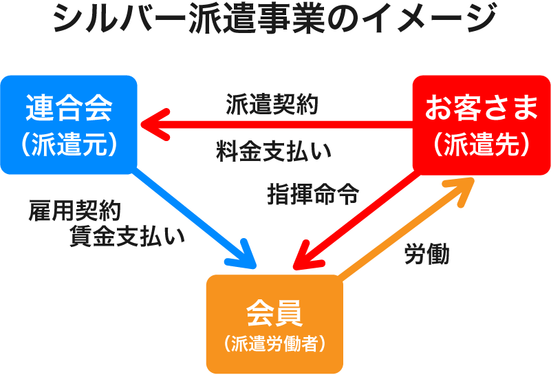 - お客さまが、千葉県シルバー人材センター連合会(「連合会」)と労働者派遣契約を結び、連合会から派遣されたシルバー人材センターの会員を、お客さまの事業所で、お客さまの指揮命令により、お客さまの社員と一緒に働かせる発注形態です。